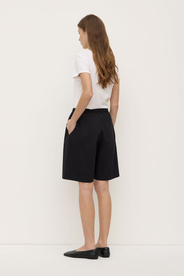 Longline cotton short offering a relaxed A-line fit on the leg. Features an elasticated waistband with an internal waist-tie for adjustability.