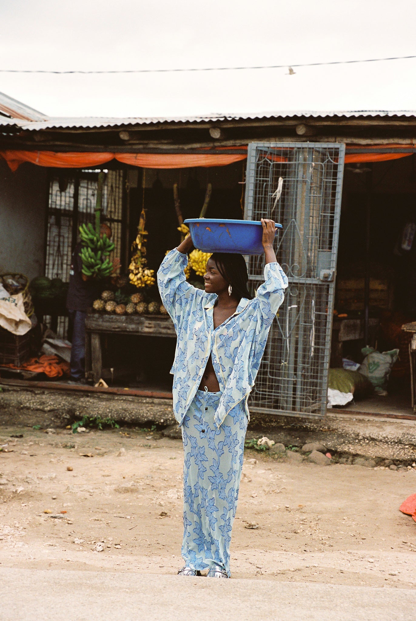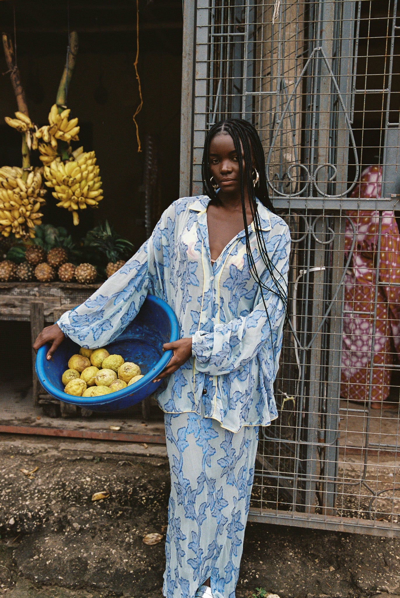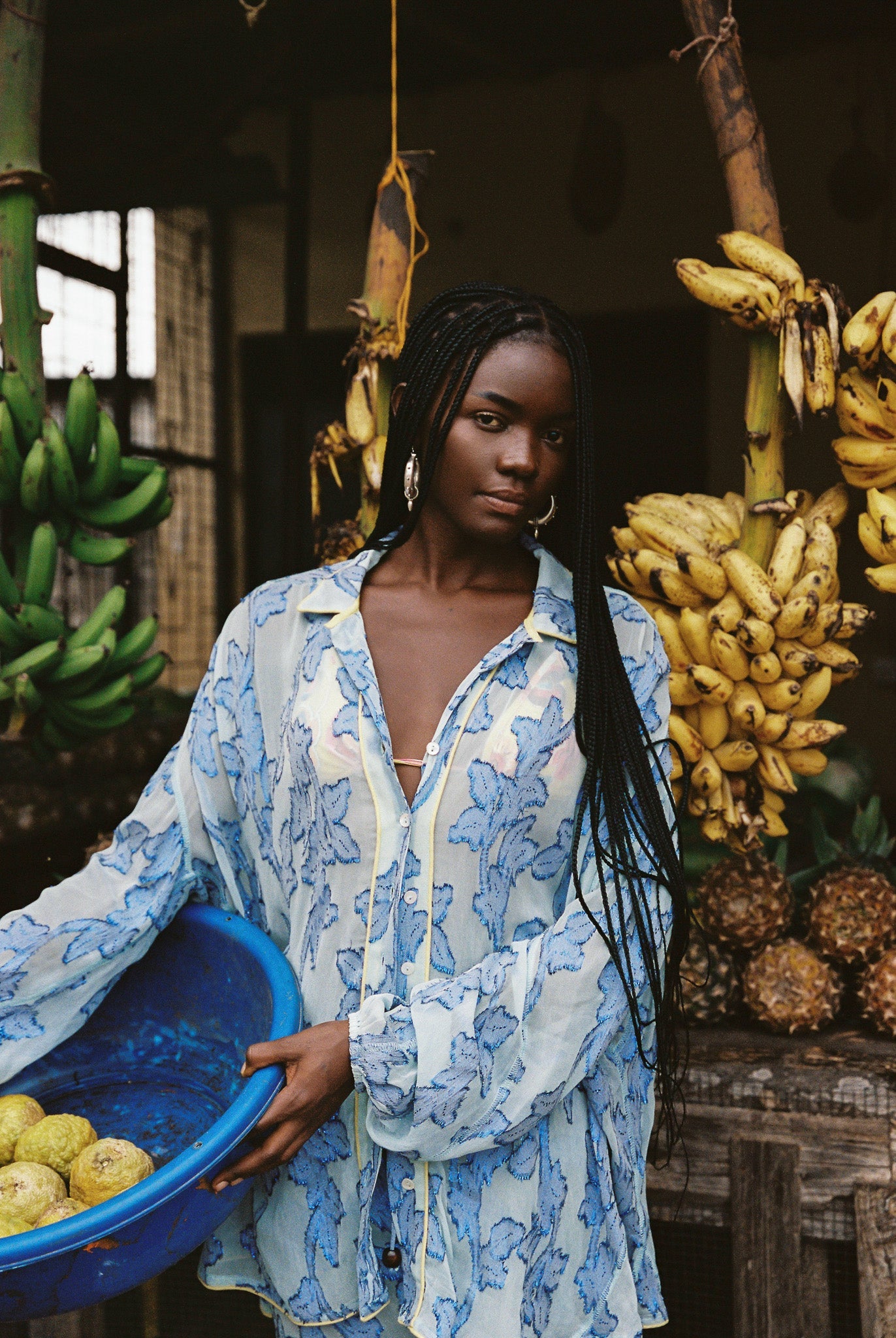 The Verde Charm Shirt is an elevated take on a classic button-down, reimagined in a sheer, lightweight fabric embroidered with bold botanical motifs in shades of electric blue. With its oversized fit, curved hemline and billowing sleeves, this statement blouse blends relaxed tailoring with an edge. Subtle contrast piping frames the design, adding a touch of detail that makes this piece feel special.